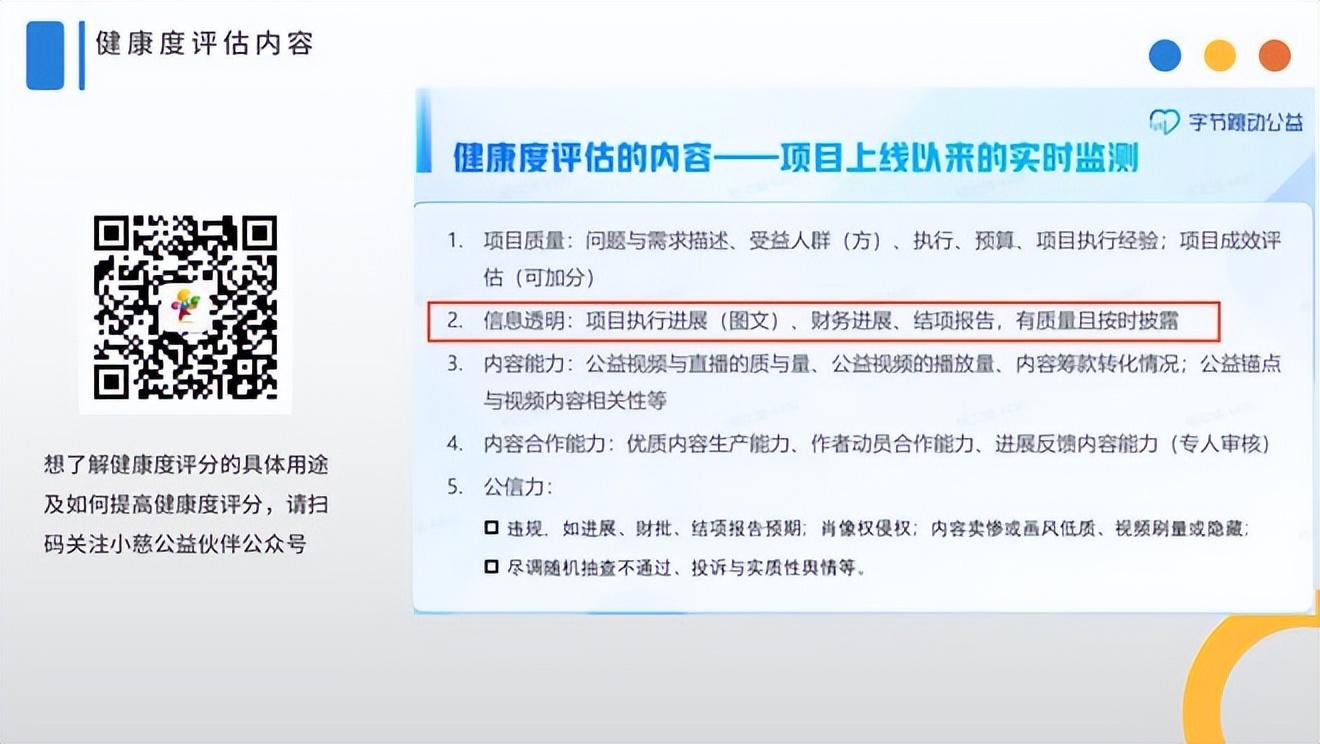 抖音平台用于监测评估所有上线筹款的公益项目以及所属公益机构运营情况的自动化评估系统,监测维度包括但不限于公益项目的设计质量、内容与合作能力、信息透明度与公信力等,并通过项目的运营和平台的内外部监督形成对入驻公益机构健康度的评估。