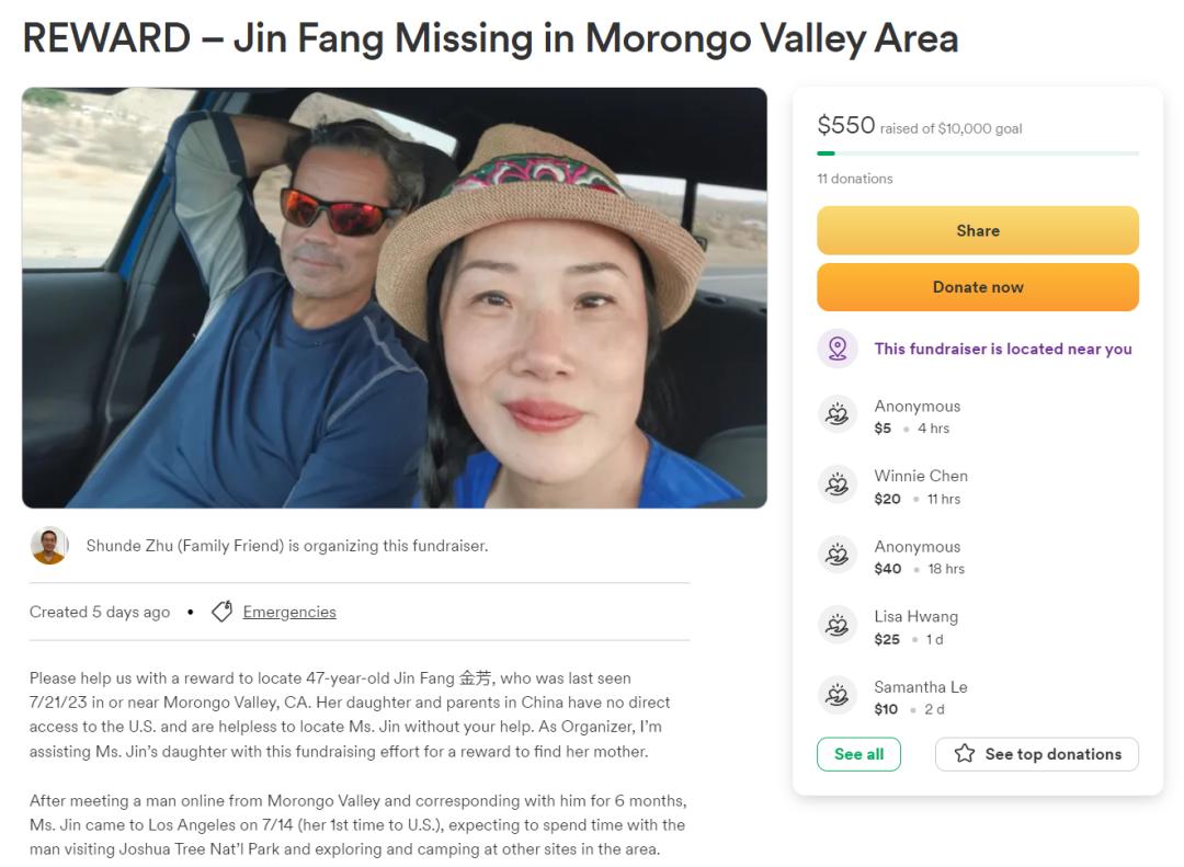 报道援引金芳友人消息称,7月14日,金芳从中国出发抵达洛杉矶,约翰于次日在加州棕榈泉车站接她,并计划一同前往加州约书亚树国家公园游玩。但从7月22日开始,金芳与家人的联系突然中断,电话和社交媒体均无法联络。7月24日,在约翰的手机最后一次对外通话后,二人彻底失联。圣伯纳汀诺县警方已发布了寻人启事,向网民公开征集有关金芳和约翰的行踪,金芳的女儿也在网上发了多条寻人启事,希望网友帮助寻找母亲。