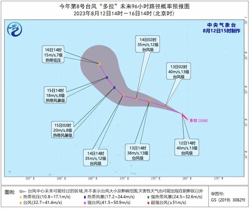 今年第8号台风“多拉”(台风级)(英文名称:Dora)的中心今天上午从中北太平洋移入西北太平洋,上午8点钟位于美国关岛偏东方向3790公里,就是北纬15.5度、东经180.0度,中心附近最大风力有13级(40米/秒),中心最低气压为960百帕,七级风圈半径165-200公里,十级风圈半径80-120公里,十二级风圈半径50公里。预计,“多拉”将以每小时25-30公里的速度向西偏北方向移动,强度逐渐减弱。