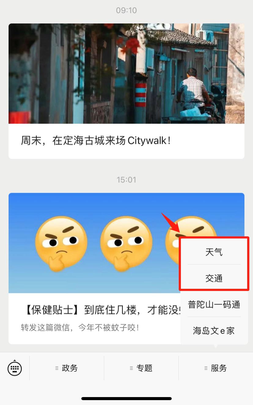 进入“舟山发布”后点击“服务”,选择“天气”或“交通”,即可查询相关信息。