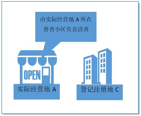 清查入户实际经营地A,调查发现该单位为一家饭店,营业执照显示该单位为法人单位,但登记注册地址在另外一个地点C。应由实际经营地A所在普查小区的普查员调查填报[621表]。