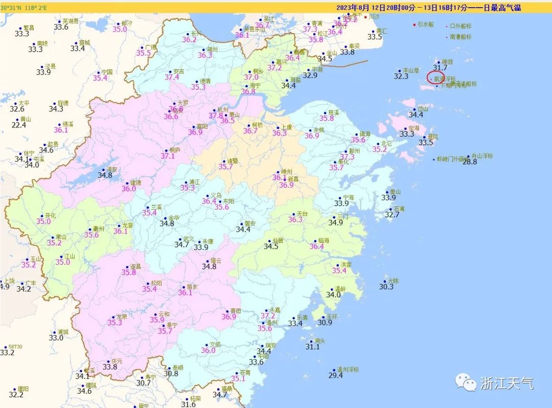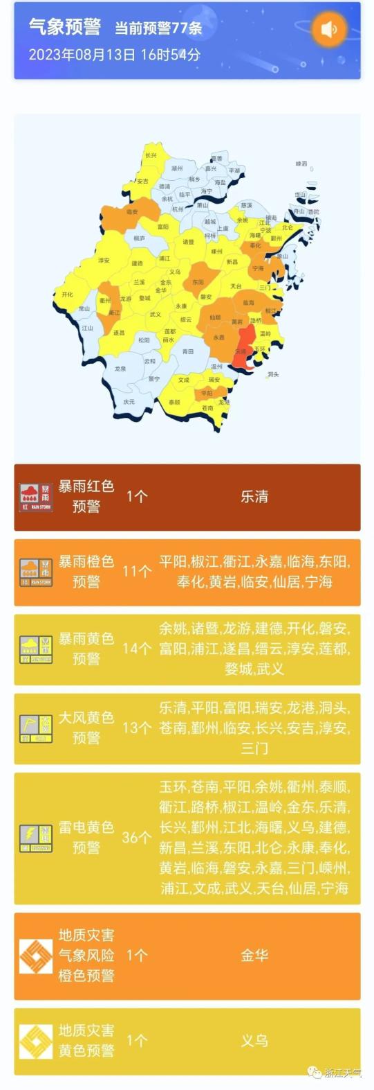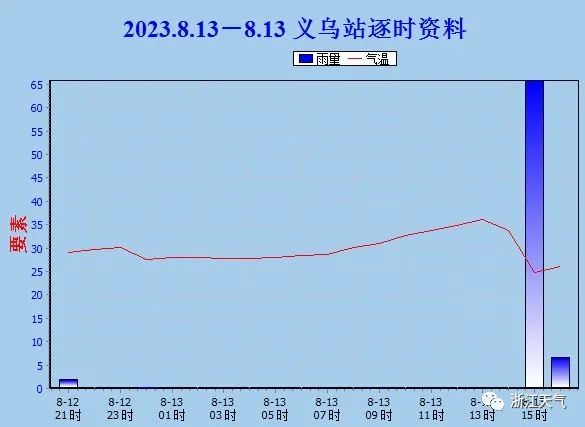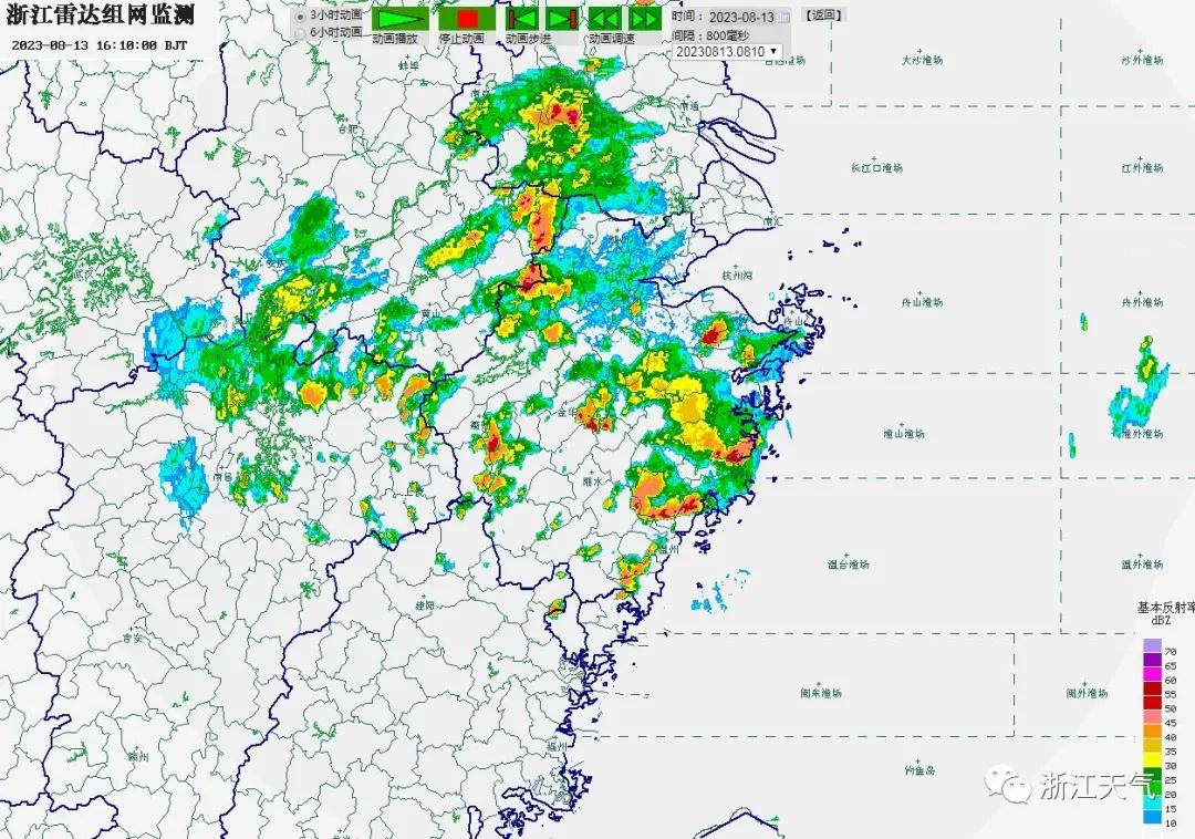 今天11时-14时,衢州市、台州市、杭州市、丽水市、宁波市、绍兴市、金华市、温州市局部地区出现短时强降水,累计降水量共6个站超过50.0毫米,累计最大降水量为衢江区灰坪村63.1毫米,小时雨强最大出现在仙居县苍岭东59.9毫米。共有4个站出现8级以上雷雨大风,最大为平阳县上头屿备份17.6米/秒(海拔37.0米)。