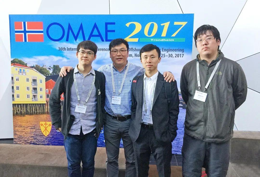 ▲陈念众(左二)与3位博士研究生一起参加2017年的海洋、离岸及极地工程国际会议(OMAE)