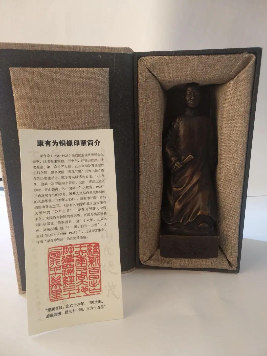 青岛市民俗博物馆的妈祖文化题材的磁性书签、手机扣;康有为故居纪念馆的康有为铜像印章;
