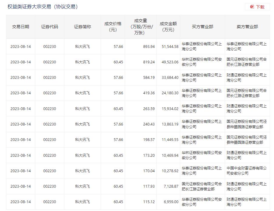 据盘后交易所披露的公告显示,当日科大讯飞大宗交易成交3995.61万股,成交额23.5亿元,占当日总成交额的42.4%,成交均价58.82元,较市场收盘价63.98元折价8.07%,其中最高成交价60.45元,最低成交价57.66元。