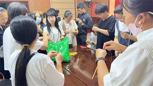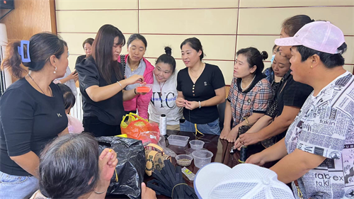 传授技艺,开拓就业渠道。活动现场,培训师对“猴拳结”“米珠发带”“波西米亚风耳环”等手工作品进行了理论讲解,以现场示范的方式手把手传授学员原材料选择、放线针法、编织技能等专业知识,群众热情高涨,满怀喜悦的心情认真仔细地学习编织手法,不时地询问老师细节,老师对每一位学员进行编织专业技法上的详细指导。