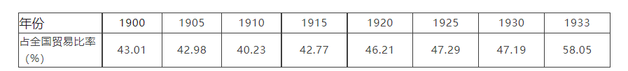 长江沿岸通商口岸进出口贸易额占全国的贸易总额趋势表(资料来源:实业部国际贸易局编:《最近三十四年来中国通商口岸对外贸统计》商务印书馆1935年版,第168页。)