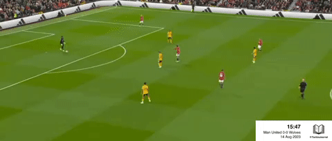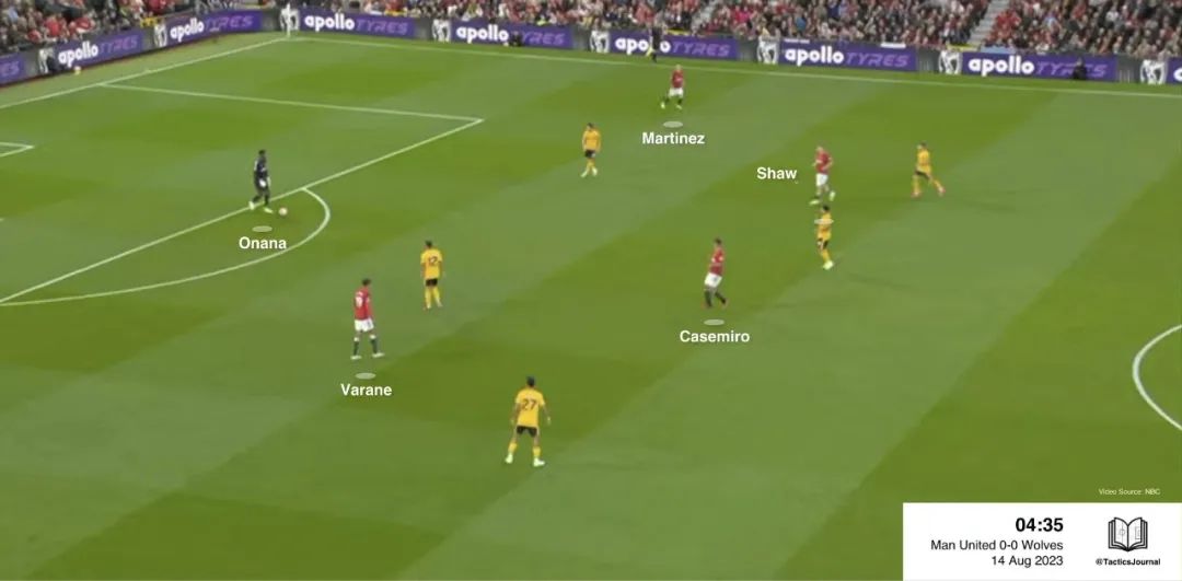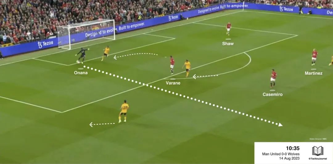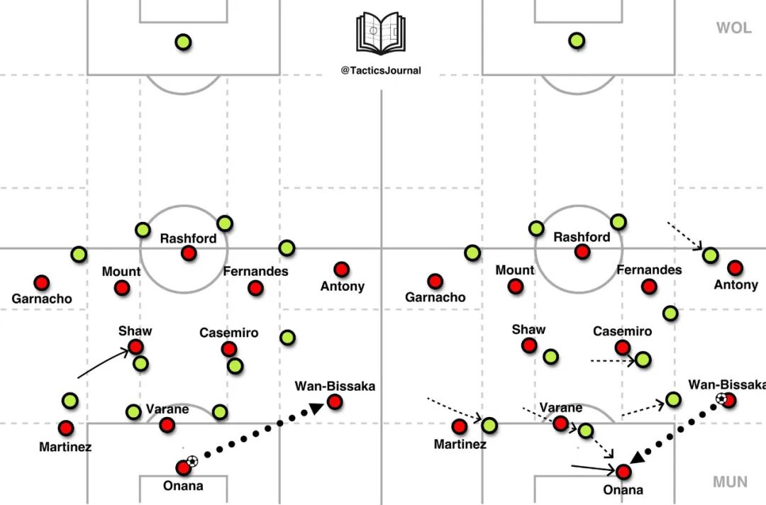 安德烈·奥纳纳的弱点在于,当他以后仰的姿态向右侧传球的时候,球速会偏慢。狼队利用这一传球特点作为启动压迫的时机,多次从曼联这边夺回了球权。