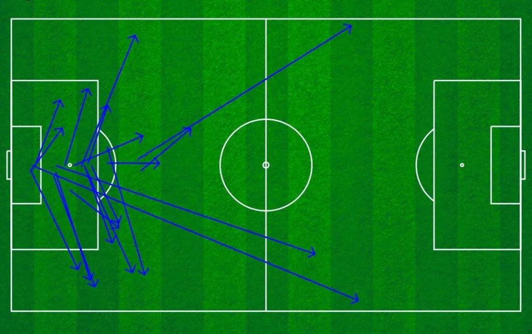 图5.1 - 奥纳纳的传球示意图对于曼联的任何对手来说,他们的防守目标都应该是迫使奥纳纳传出这种传球,因为这种传球下的失误概率大大上升。可能是奥纳纳直接的传球失误,也可能是奥纳纳传球速度太慢导致队友控球难度上升出现的失误。