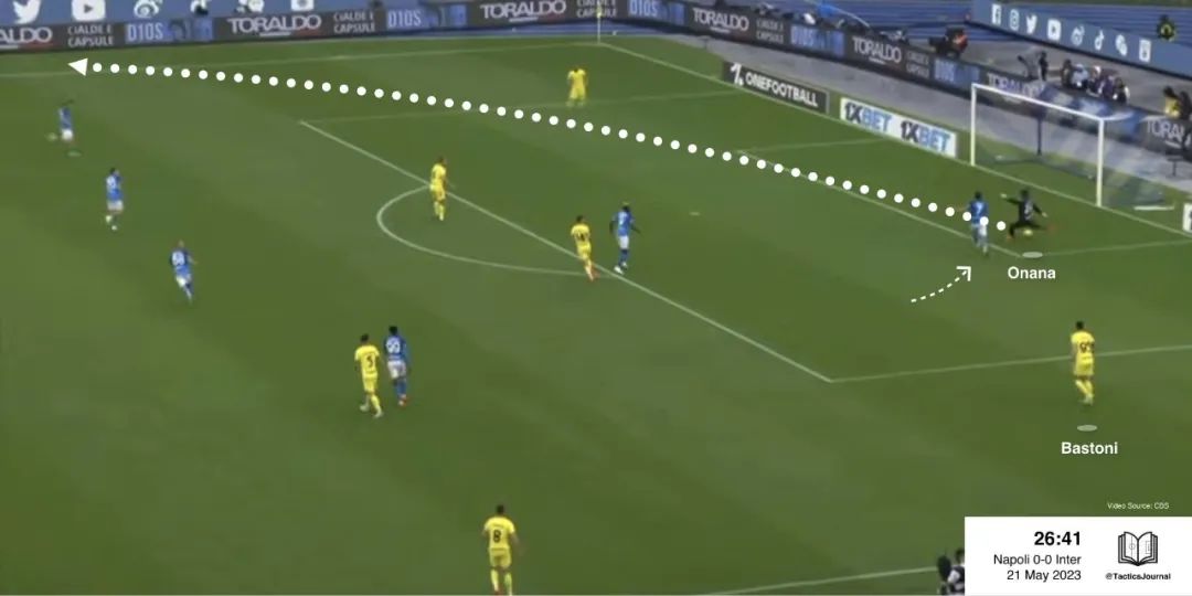 图3.1 -(2023年5月21日)奥纳纳在压迫下向右侧纵向传球。奥纳纳的弱点就在于此——当他以一定角度的后仰姿势向右传球时。