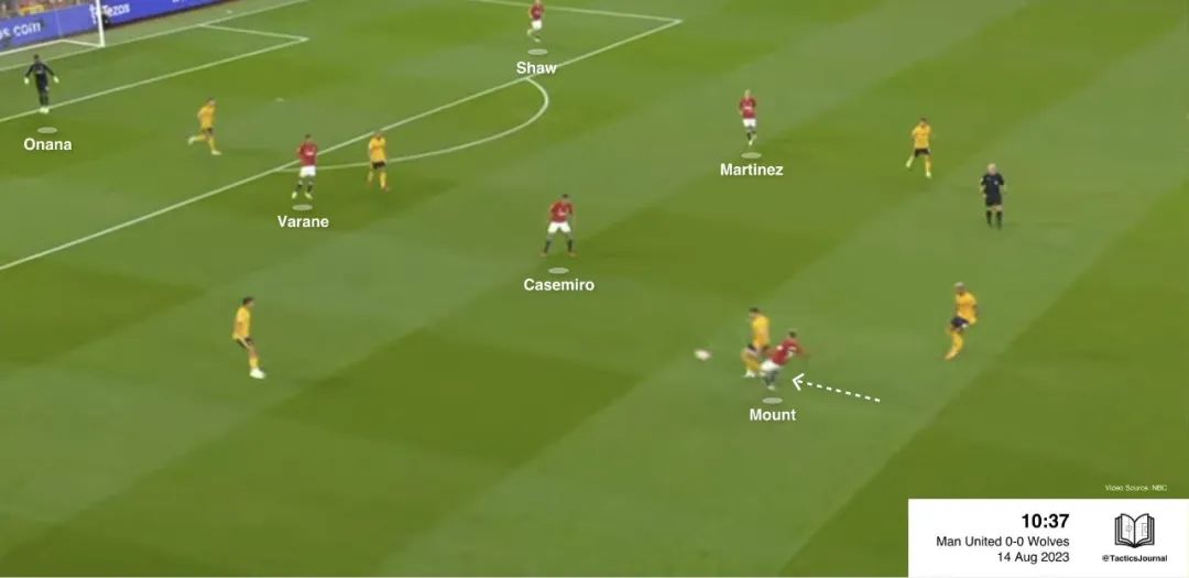 图4.1 - 狼队通过曲线逼抢迫使奥纳纳长传。奥纳纳选择将球贴地传给梅森·芒特。