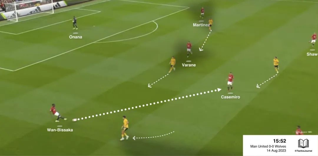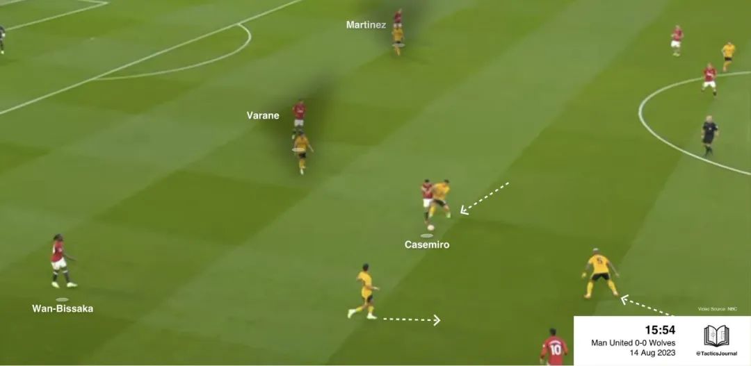 因此,狼队会利用防守阴影的覆盖逼迫曼联向右侧转移球,然后让右后卫万·比萨卡处于空当。狼队让他有足够的空间,告诉曼联“看,这就是你的出球点”。然而,这是个陷阱。