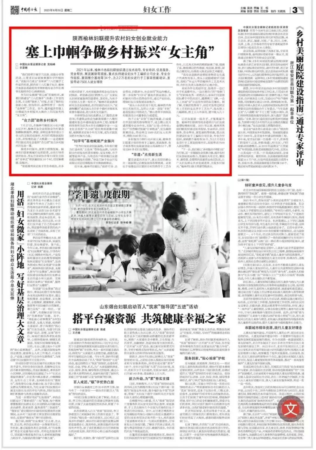 8月15日,《中国妇女报》刊登了《陕西榆林妇联提升农村妇女创业就业能力——塞上巾帼争做乡村振兴“女主角”》一文,全文如下: