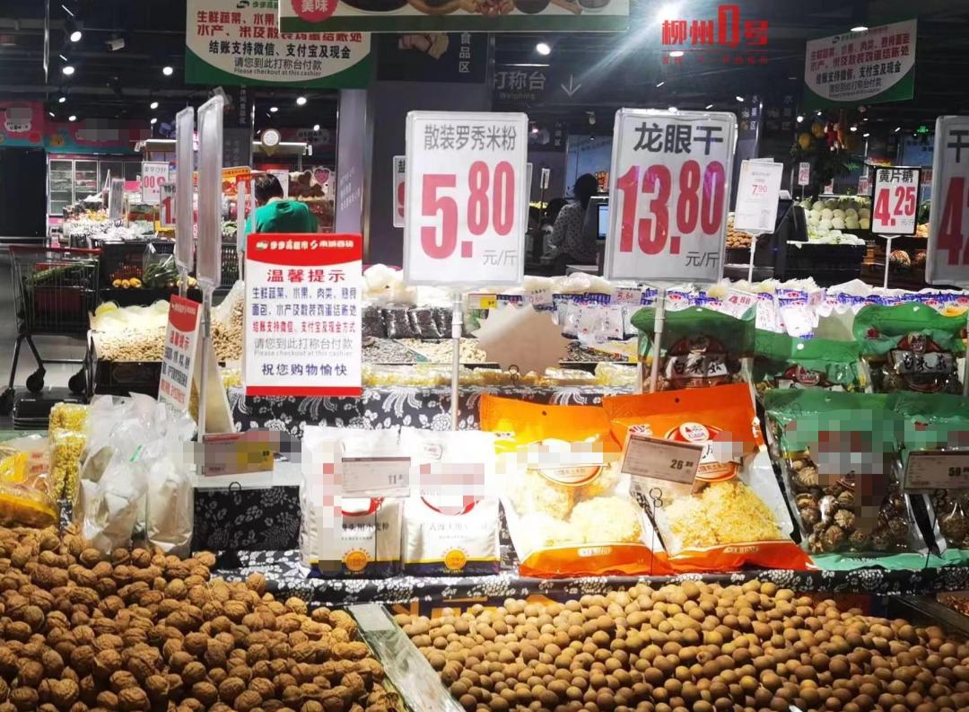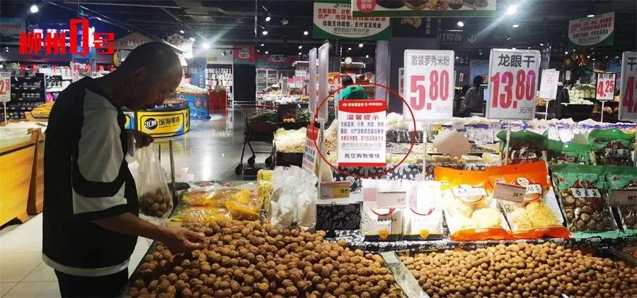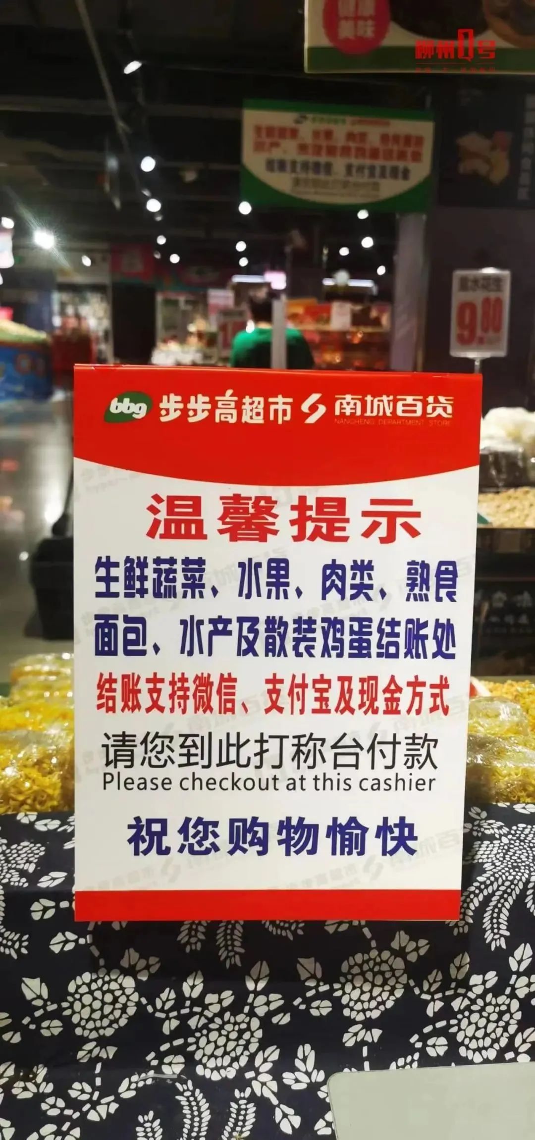 货架及横梁上均贴有温馨提示15日上午,记者来到南城百货柳太路店。该店生鲜区食材丰富,前来购物的市民很多。货架及横梁上,贴有一段温馨提示:生鲜蔬菜、水果、肉类、熟食、面包、水产及散装鸡蛋结账处,结账支持微信、支付宝及现金方式,请您到此打称台付款。