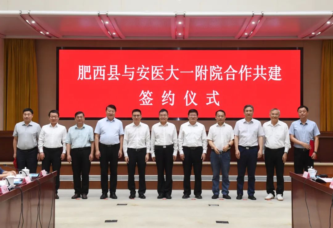 省医保局局长金维加,安徽医科大学党委书记顾家山,合肥市委常委、常务副市长张泉,省发改委副主任郭浩,省教育厅副厅长解平,省卫健委副主任杨绪斌,安徽医科大学党委副书记、安医大一附院党委书记谢瑞瑾,安徽医科大学副校长余永强,县委书记陈伟等共同见证签约。