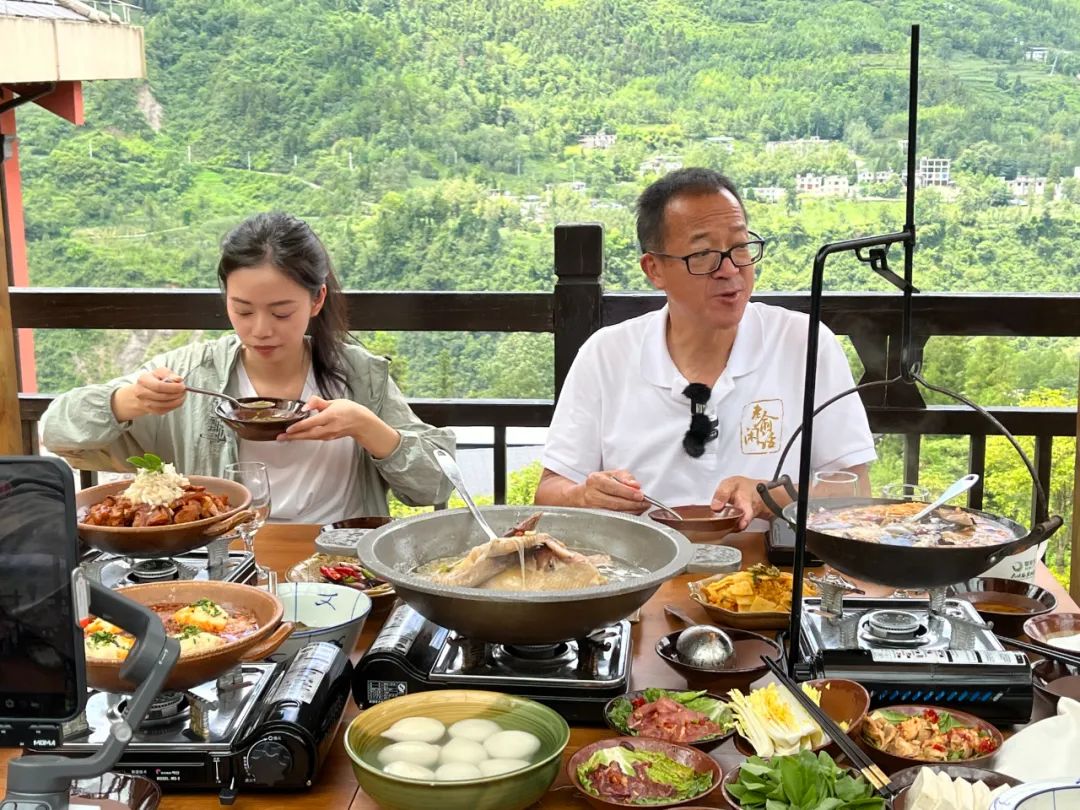 图/湖北文旅集团东方甄选第一站到恩施大峡谷,以大峡谷为背景品尝推介土家美食。