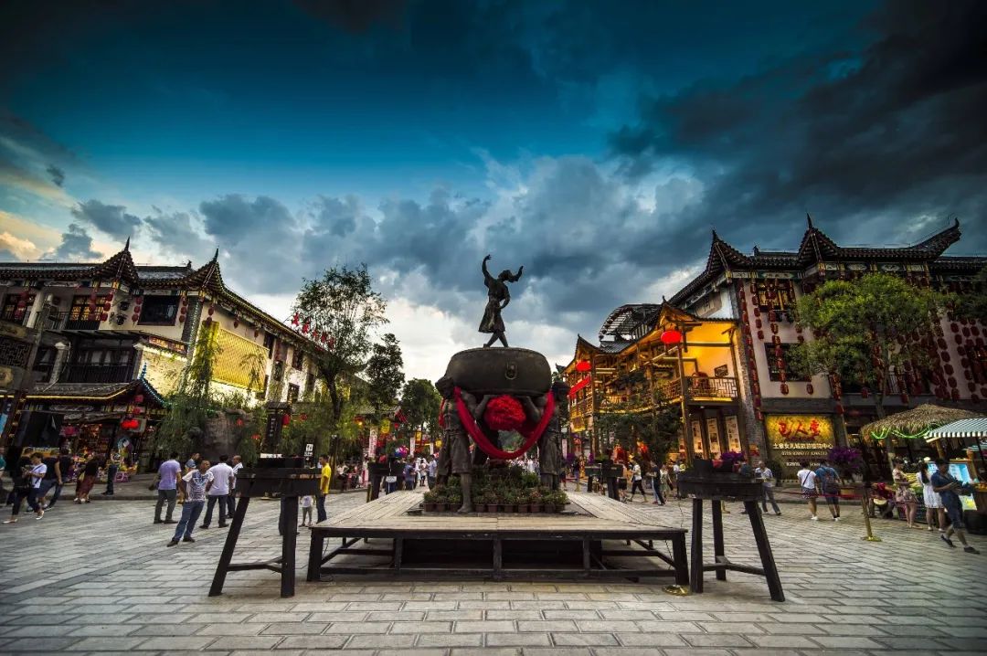 图/恩施土家女儿城景区团队步行前往女儿城文化广场品尝长桌宴、 体验摔碗酒。同时观看龙船调、摆手舞。
