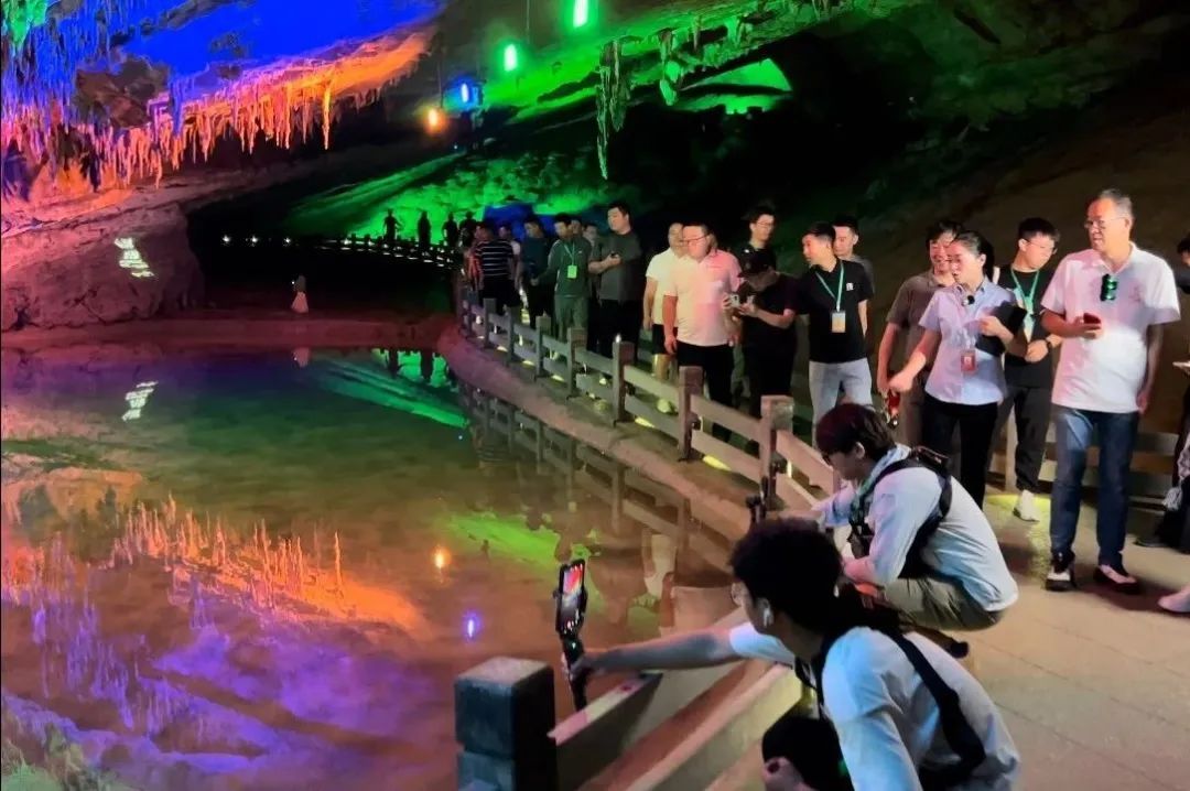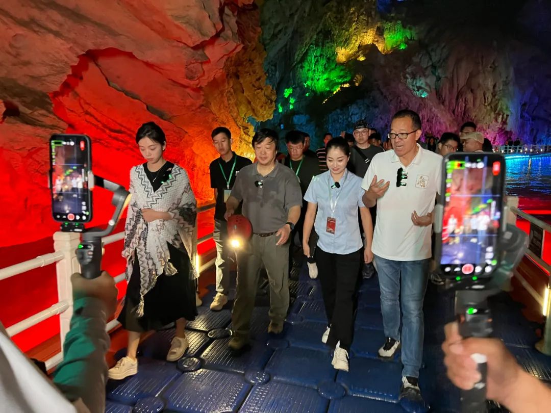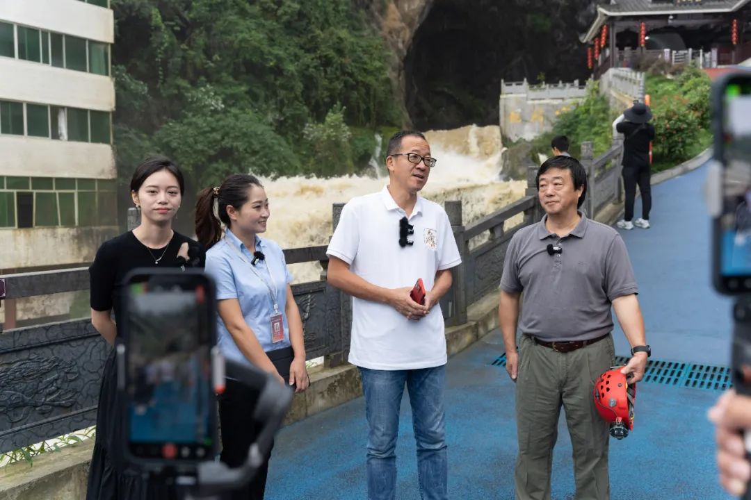 图/恩施州国投集团直播团队通过水上浮桥进入洞内,探访洞内秘境,感受夏日18度的凉爽。