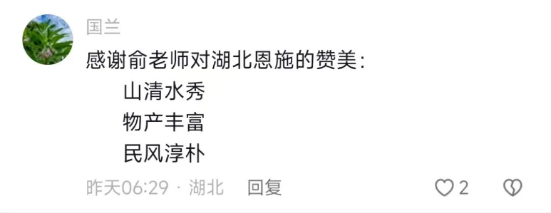 俞敏洪在接受采访时表示,恩施确实山清水秀、民风淳朴、物产丰富,所以非常开心,在湖北的第一站选择恩施。
