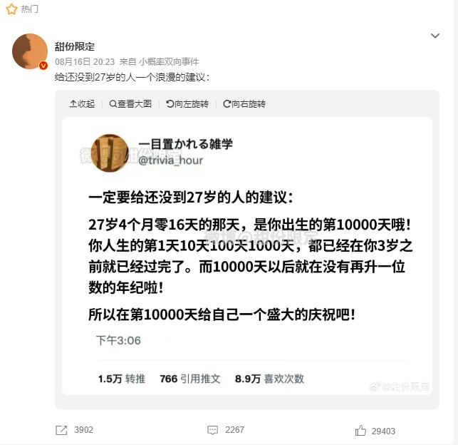 昨天,一条浪漫的话题登上热搜,意为告诉还没到27岁4个月16天的人一个浪漫的提醒,如果到了这一天就是你来到这个世界的第10000天,而浪漫的建议就是,又多了一个给自己庆祝的理由。