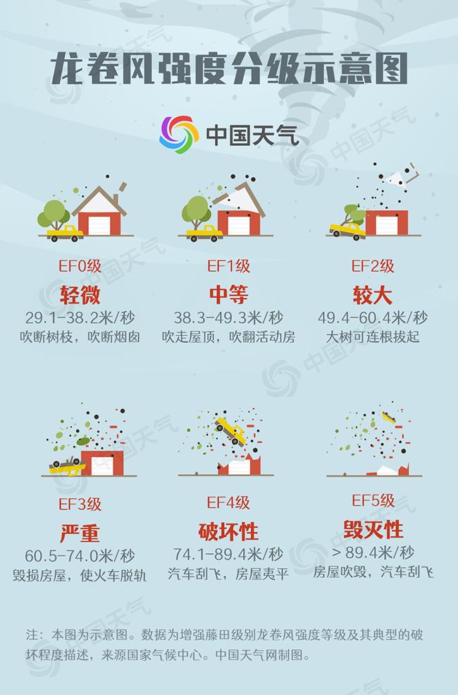 据悉,EF0-EF1级龙卷风,在龙卷风等级中属于较弱等级,但一旦出现仍有可能带来一定破坏。