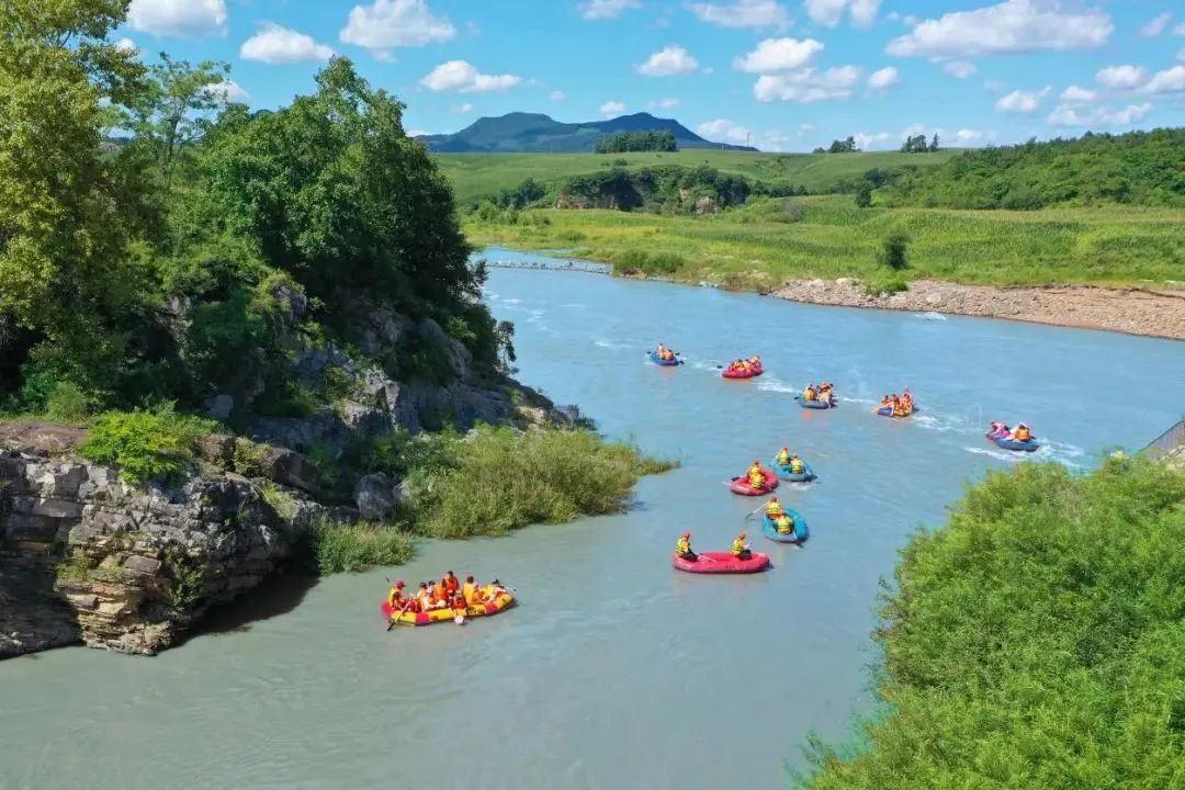罗通山镇逸景大峡谷冲浪漂流项目全程11.7公里,漂流时长约2小时,是一处兼具娱乐性和刺激性的皮筏冲浪漂流。山水之间,林荫树下,游客们携三五好友顺流而下,赏美景、打水仗。玩累了,伴随着绝美的夜色,还可以参加篝火晚会,品尝特色烤全羊,别有一番风味