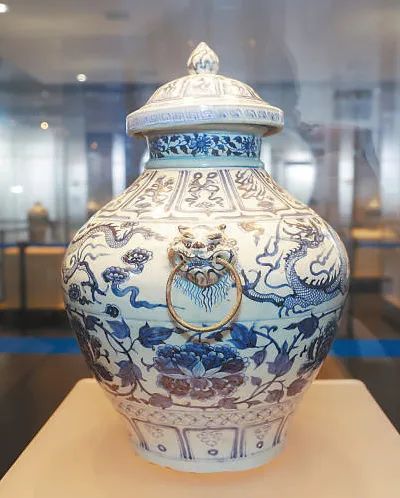 移步博物馆元代窖藏厅,青花云龙纹兽耳衔环盖罐便映入眼帘。釉色白中闪青,釉质莹润,纹饰多达12层,主体纹饰是云龙纹和缠枝牡丹纹,青花色泽苍翠浓艳,纹饰运笔酣畅有力。