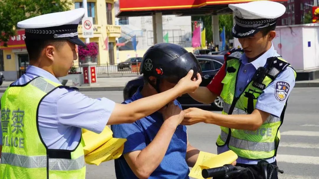 在辽源市东丰县,当地交警部门组织民警在辖区内持续开展“一盔一带”专项整治行动,引导驾乘人员正确佩戴安全头盔,进一步提升驾乘人员安全防护水平。