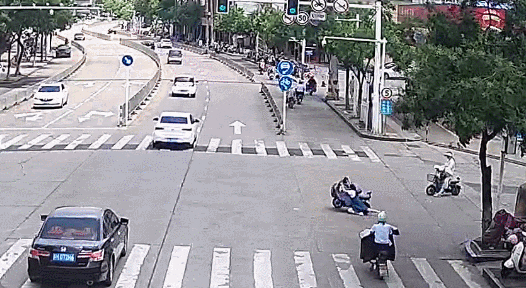 电动车拖着女孩前进到路口后,失控向左侧撞去,而此时直行绿灯,机动车道上的汽车正在正常通过路口。监控显示,失控的电动车拖着女孩在路口左转,径直撞上一辆直行黑色轿车。撞击后,轿车从女孩的肩部压了过去。
