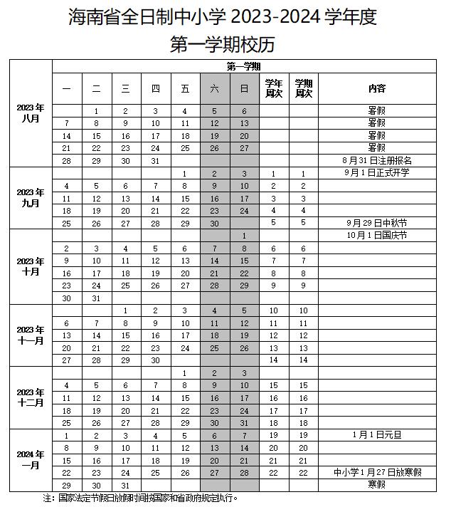 第一学期:中小学统一于2023年9月1日开学,2024年1月19日结束。寒假从2024年1月22日开始,2月18日结束。