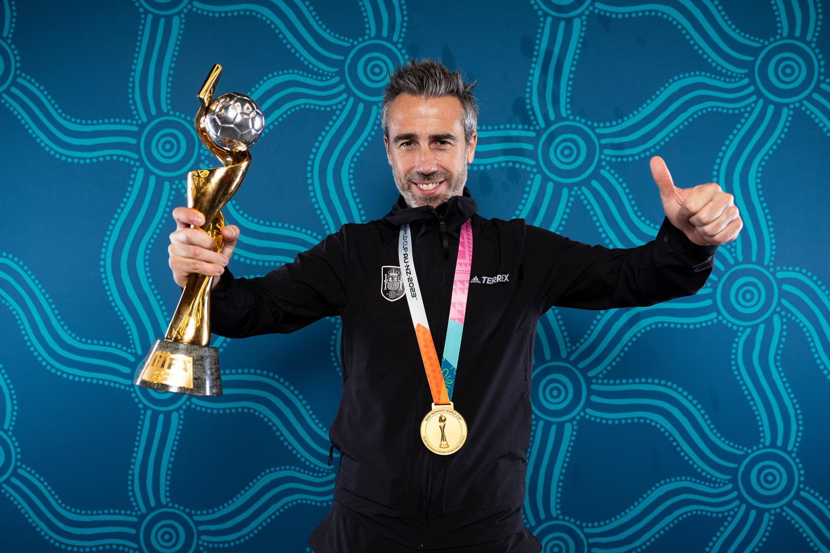 西班牙女足夺得世界杯冠军后,全队拍摄冠军写真,图为西班牙队主帅比尔达。图据视觉中国