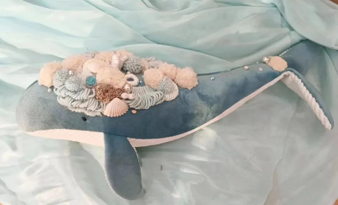 鲸:一念山河成,一念百草生,那一抹蓝影是暗藏在大海的温柔。生在海边的我们,用棉绳编织、用贝壳装饰,表达它温柔的美,感谢大自然带来的美好。