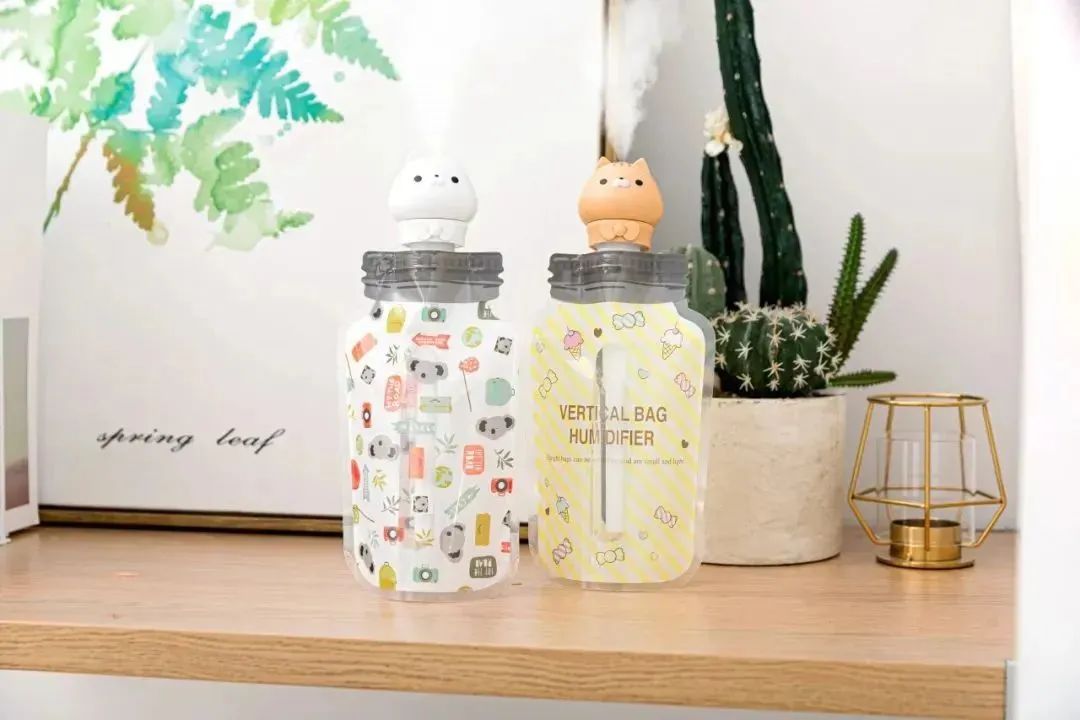 加湿器袋身图案及造型有多种设计,可以满足不同人群的审美需求;开关人性化设计为6小时自动断电,整晚不用起床开关电源;袋身容量为400毫升,整晚用水量在250毫升左右,不用担心房间会太湿或太干;5V电源供电,用电量很小,充电宝及USB口都可用。