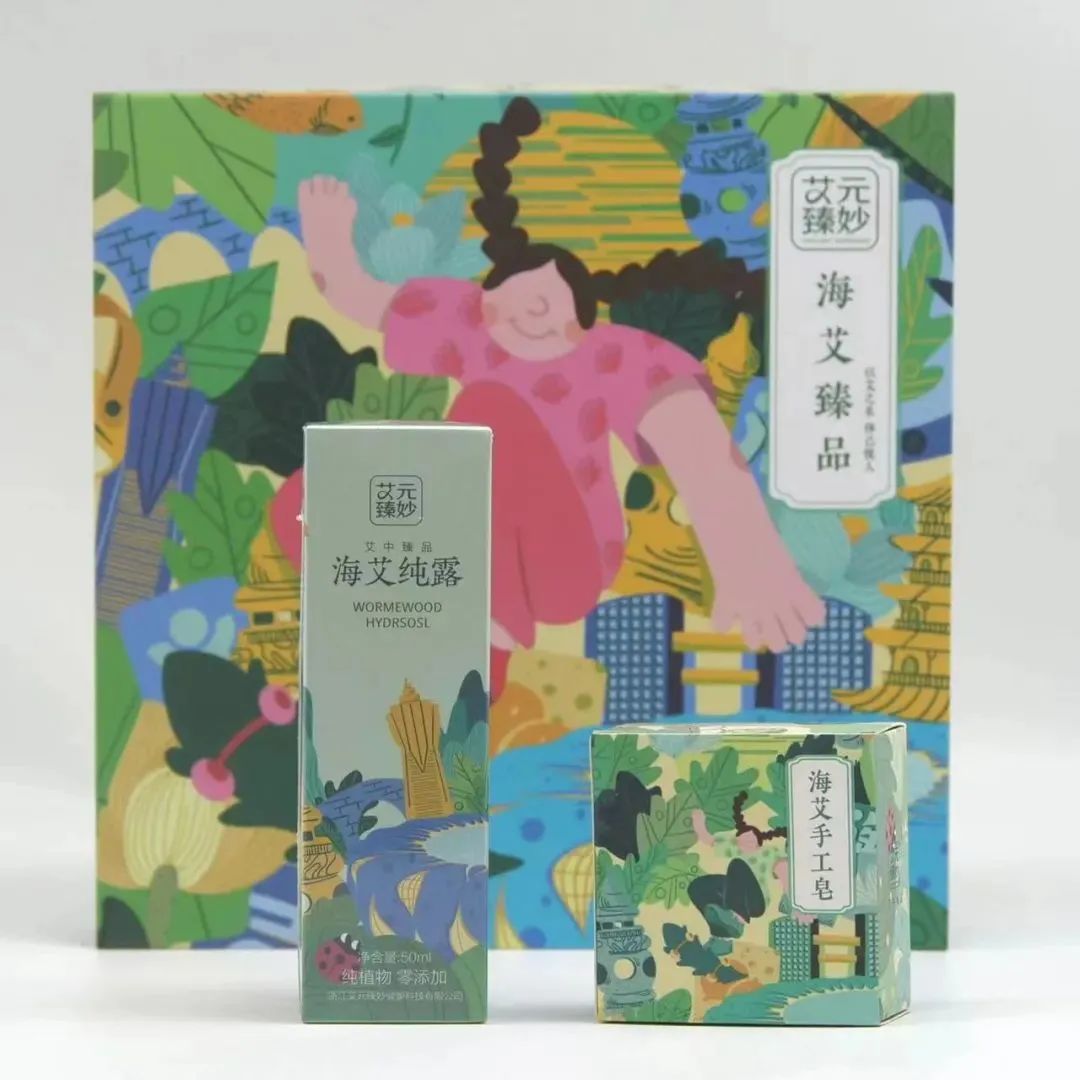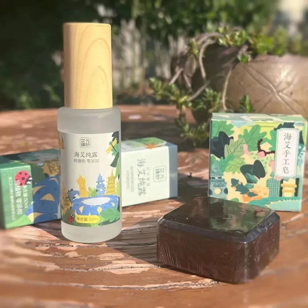 海艾纯露是海艾精油蒸馏萃取过程中所得的冷凝水溶液,是一种100%饱和的蒸馏原液,成分天然纯净,无任何添加剂,有淡淡的艾草香,能镇静舒缓过敏、泛红、湿疹等肌肤问题,可用于日常护肤,又可止痒防蚊,用途广泛;艾皂的主要成分是海艾提取物和无患子,具有抑菌、消炎、舒缓、清洁等作用。