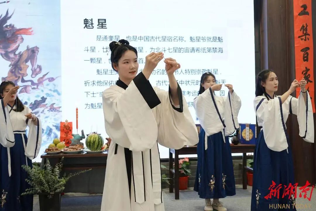 “家家乞巧望秋月,穿尽红丝几万条”。在雅乐伴奏下,通赞用文言文引导仪式正式开始。只见主祭着宋制“深衣”缓缓登场,先至“濣浣所”净手,再登上“九引台”诵读《乞巧文》,依次向牛郎织女星和魁星献爵祭拜。此时,“九引台”上有序陈列着《梦华录》中记载乞巧所用物件:“双头莲”取花开并蒂的祥瑞,“磨喝乐”即泥人,“水上浮”即蜡花儿,“花瓜”“笑靥儿”“果食将军”则是雕花供果、巧果、果仁等。此外还有笔砚、印章等文房用具,湘绣、年画等非遗女红。主祭在6名礼生的簇拥下,带领市民游客一起对月穿针乞巧,仪式圆满结束,众人分食供品,共沾福气。