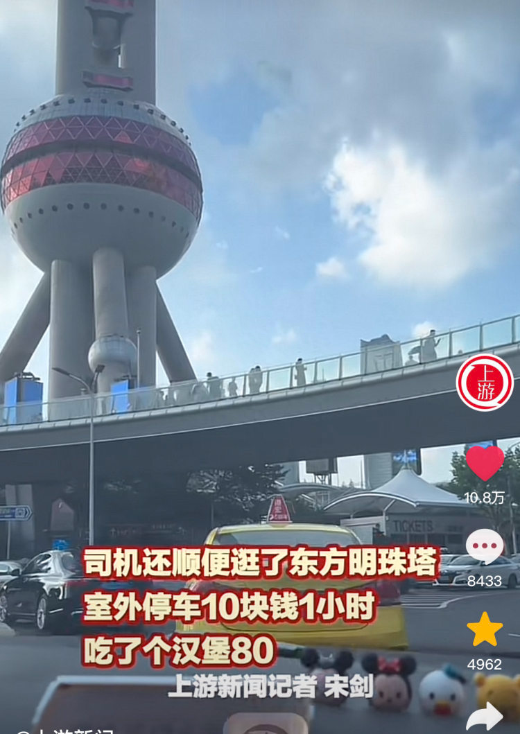 “明珠塔附近露天停车场10块钱1小时,我下车去参观了之后赶紧就开走了……”唐文浩惊叹地说,在路边店里买了个汉堡,“坐的地方都没有,就要80块!”