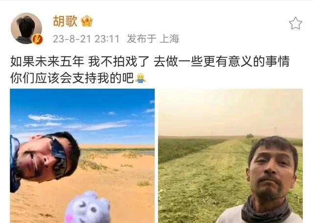 8月21日深夜,著名男演员胡歌突然发了这篇欲语还休的微博,并附上两张以沙漠为背景的自拍照。很快,“胡歌五年不拍戏”登上热搜榜第一,引发网友对其“又要退圈”的猜测,“这是要去沙漠种树?”为什么要说“又”呢?因为多年前,正当红的胡歌就斩钉截铁地说要去留学充实自己,对名利场表现得毫无留恋。而从胡歌这一次发文内容来看,他是准备把自己的时间都花在公益事业上,甚至不惜搁置表演事业。