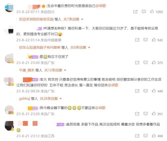 记者在胡歌的社交平台留言区看到,不少粉丝并不支持胡歌这种“退圈”行为。一位激动的粉丝连发数条留言,希望胡歌能三思而后行,“你去数数你这几年拍了几部戏?产量低到极致了还想减?不支持不支持不支持!”