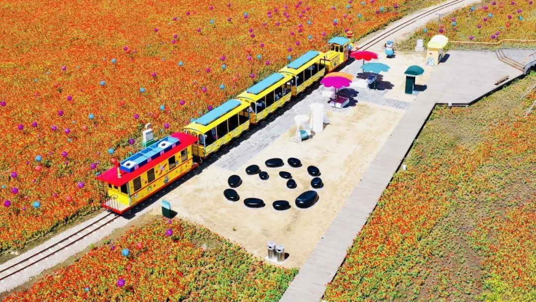 穿过木栈桥,坐上小火车,花海光影间是如梦境般的绚烂景色。