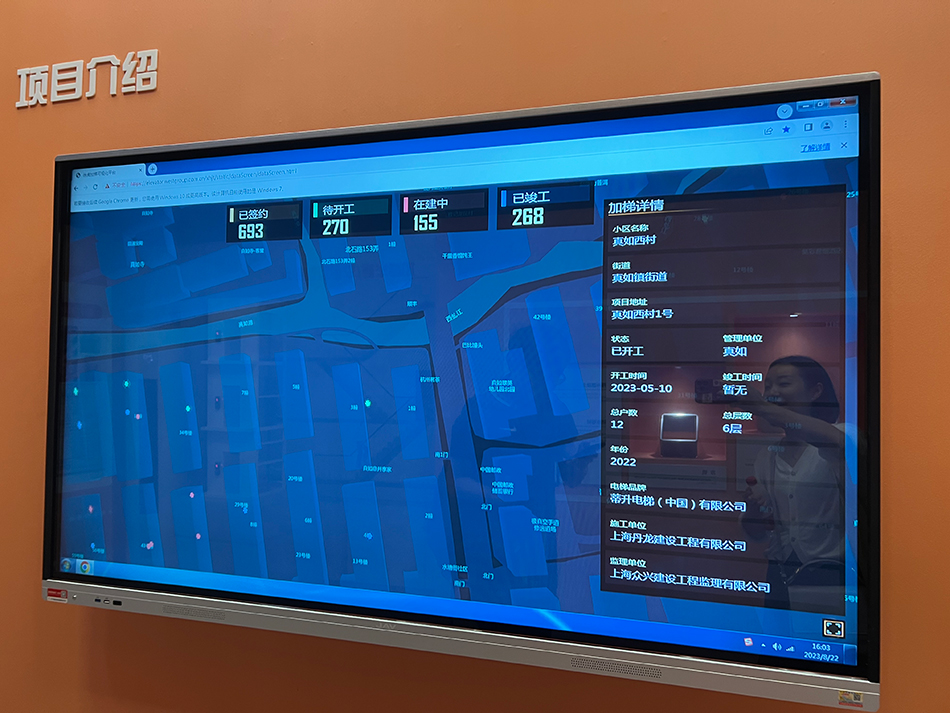 在位于普陀区中山北路1258号西部匠心·实训工坊内,澎湃新闻记者看到一个蓝色大屏幕上,清晰可见普陀区“已签约”、“待开工”、“在建中”、“已竣工”加装电梯数量,同时可以具体查阅到每个加装电梯小区的开工时间、施工单位、电梯品牌、建设状态等各类信息。同时,现场还可以看到加装电梯模型以及详细流程图。