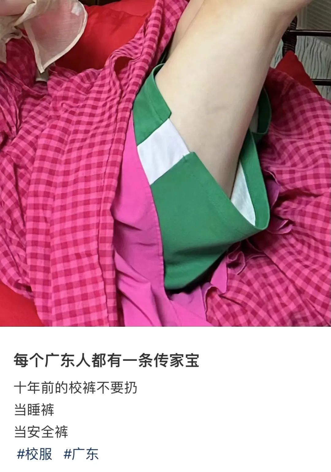 当睡裤则是校服裤最普遍的命运。(图/@好运冰美腻)就算洗得掉色、磨得发白、橡皮筋都断了,广东人还是会倔强地在任何一个时刻套上它。