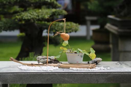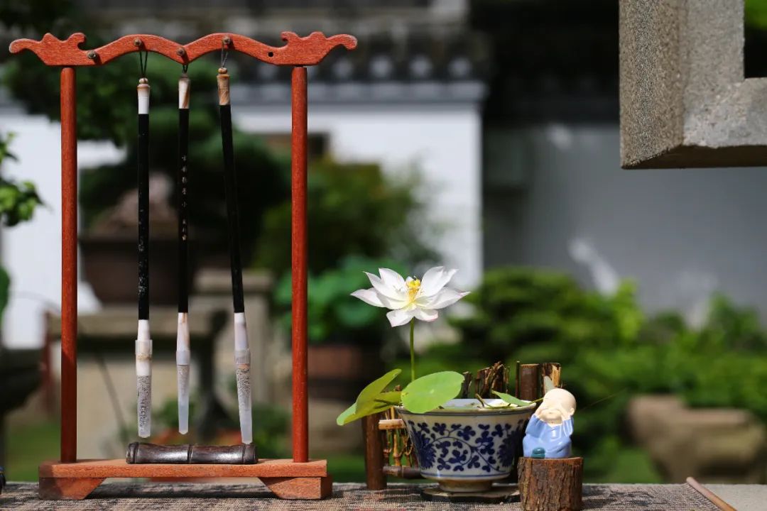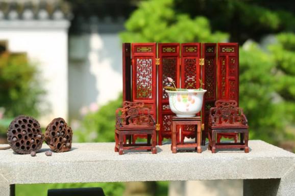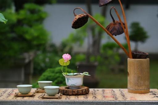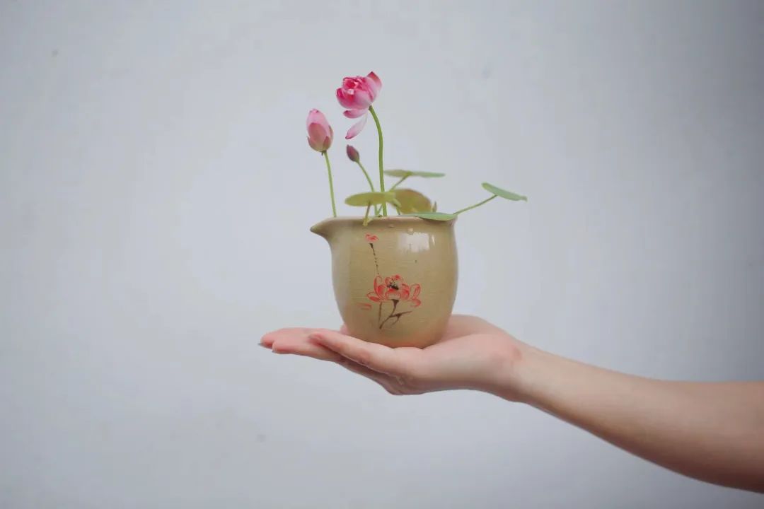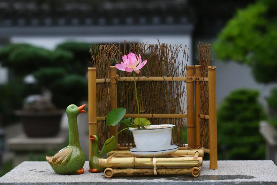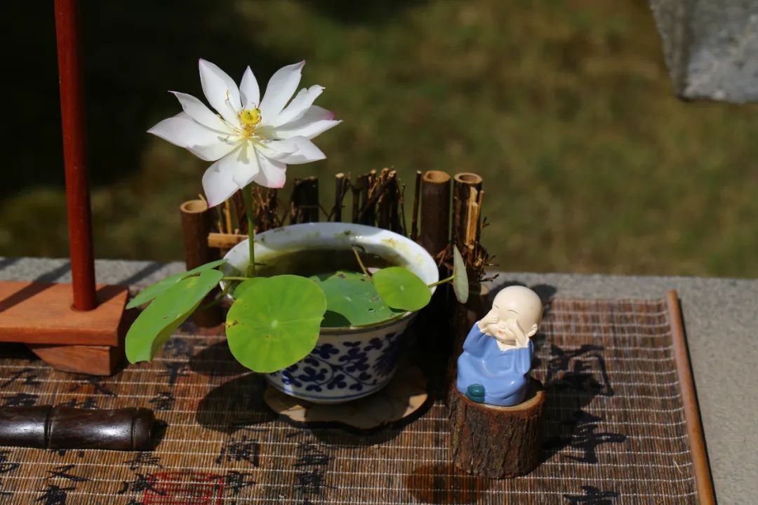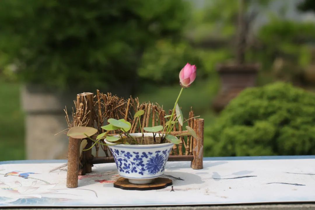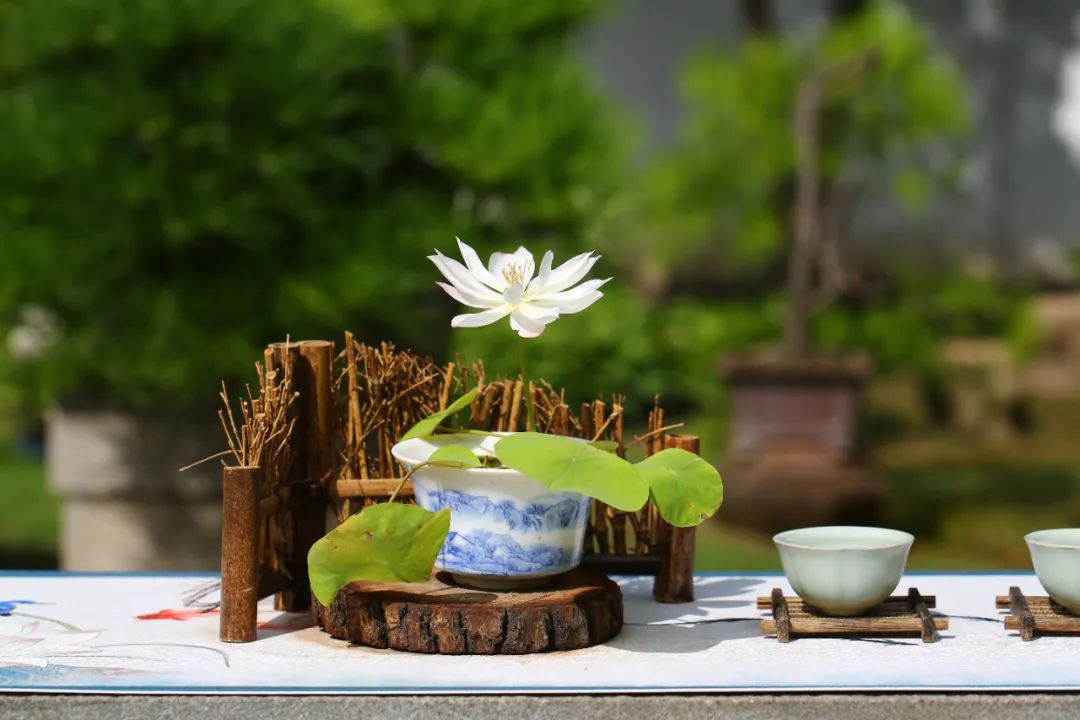 将茶杯碗莲与竹筏、木船、小桥、杯盏、毛笔、茶席等小品搭配,确能构成令人神往的意境,极富雅趣。话不多说,让我们来看看荷花睡莲展期间的作品吧。