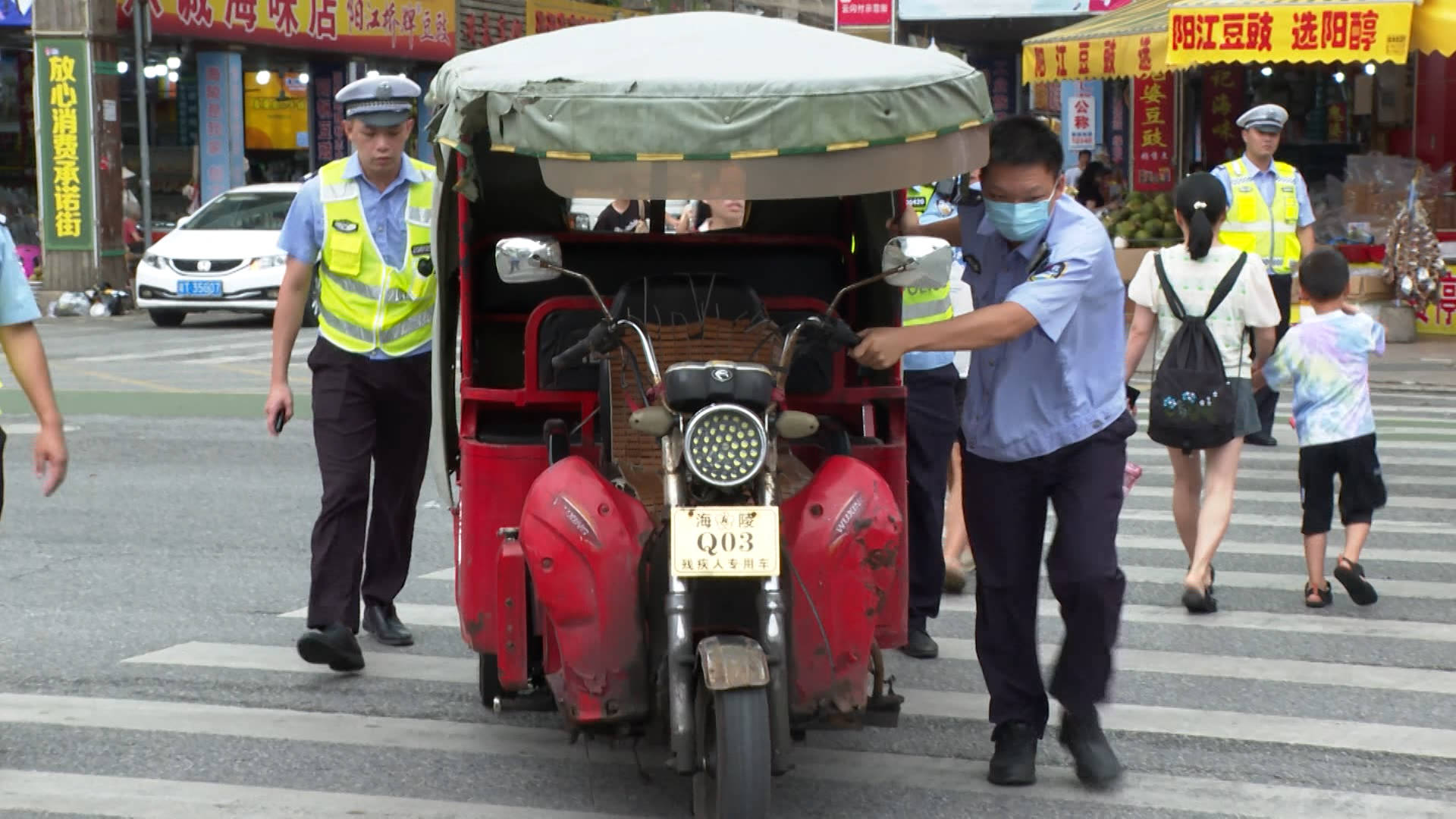 闸坡旅游大道一夜埕特产街路口段,是车辆乱放、车辆违规行驶、容易造成拥堵交通黑点。8月19日上午,交警海陵大队组织警力对该路段进行整治,交警在加大疏导力度的同时对乱停放的车辆司机未离开的,给予警告,劝告司机驶离,对司机不在车内的按《交通法》有关规定进行处理,对在道路中行驶的无牌无证三轮摩托车、二轮摩托车,交警将其截停,查阅有关证件后依法查扣,行动中查扣多辆无牌无证机动车。