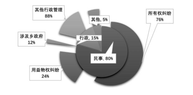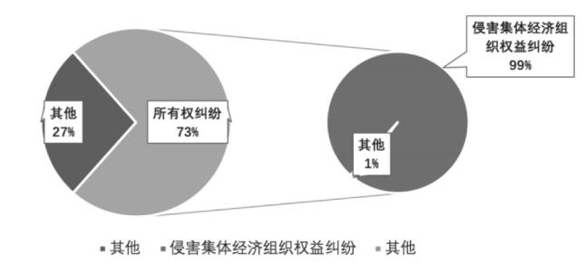 截至2022年7月4日,在北大法宝司法案例中以“村规民约”为关键词进行全文检索,总共检索出52393件案例。案由为民事纠纷的共计42695件,其中物权纠纷38322件,物权项下所有权纠纷27997件,用益物权纠纷8692件,所有权项下侵害集体经济组织权益纠纷27646件;案由为行政的为8195件,其中涉及乡政府共946件,其他行政管理(如农村集体经济组织成员资格确认)2798件。经过初步筛选案件可以发现,与村规民约相关的案件中,民事案件占据80%左右,其中物权的纠纷又占据近90%,在物权纠纷中的所有权纠纷项下侵害集体经济组织权益纠纷占据近99%。因此,在民事纠纷中70%左右的是侵害集体经济组织权益纠纷。(见图1、图2)
