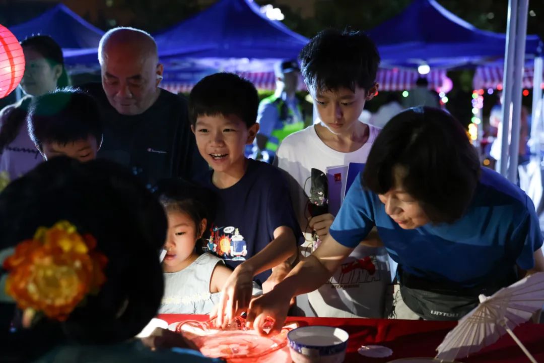 手工鲤鱼灯、扎染围巾、油纸伞彩绘、梳妆灯DIY等民俗摊位上人头攒动,古美区级非遗项目面塑、苏绣团扇引来许多市民好奇围观……