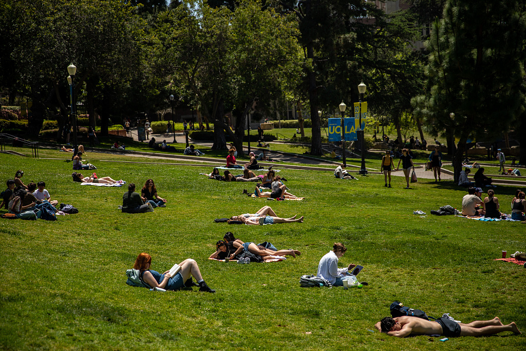 当地时间2023年4月26日,美国洛杉矶,在阳光明媚的午后,UCLA的学生在草地上享受日光。视觉中国 资料图