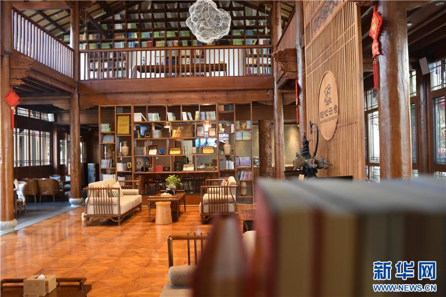 泊心云舍·文苑大堂里的书吧(8月15日摄)。新华网发(陈俊佳 摄)