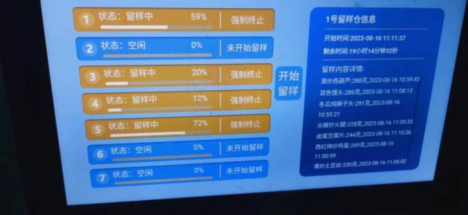 记者随手点开1号留样仓信息,控制面板上立刻显示出一份留样清单,当天中午制作的饭菜信息在显示屏上一目了然。上面显示:留样开始时间8月16日11点11分37秒,保存剩余时间还有19小时14分钟32秒。当天留样的饭菜共有7个品种,样品包括清炒西葫芦288克、双色馒头286克、冬瓜炖狮子头291克、尖椒炒火腿228克、卤蛋豆腐片244克、西红柿炒鸡蛋269克、清炒土豆丝230克。
