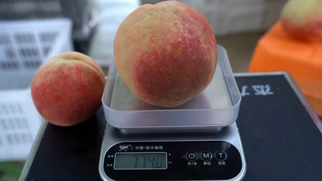 这个“桃王”的诞生,着实让果农陈文轩下了不少功夫。“引进这一品种有十多年了,随着对品种习性了解的加深,现在留下的基本上都是‘一枝一果’,一棵树最多也就留120到130个果,每个基本上300克到350克重。这个桃子有774克,是这么多年以来最大的一个。”陈文轩表示。