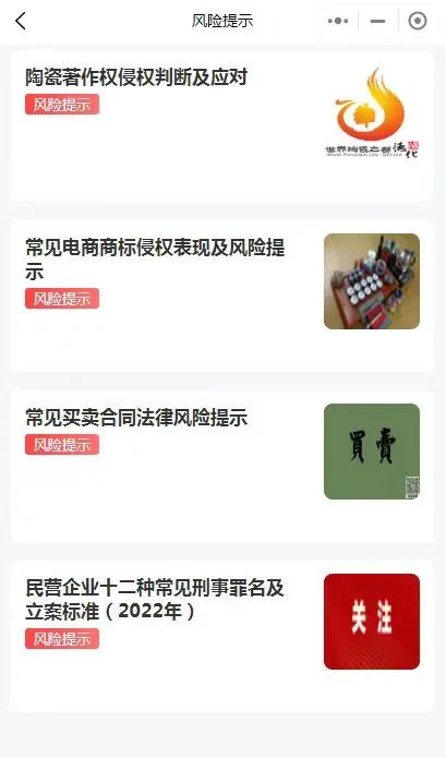 图 | 开展青年企业家法律座谈上门问需精准服务、护航企业健康发展已成为该院营商环境助企服务队的传统项目,受到一致好评。同时,为实现对企业难点、堵点、痛点问题的实时把握、靶向治疗、精准服务,该院先后制定了《常见买卖合同法律风险提示》《陶瓷著作权侵权判断及应对》《常见电商商标侵权表现及风险提示》等内容,有效帮助企业提高风险防控能力,从源头规避诉讼风险。